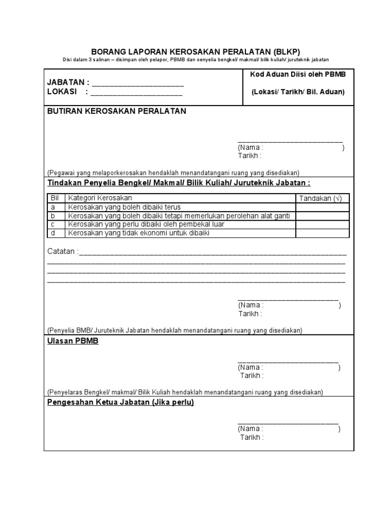 Borang Laporan Kerosakan Peralatan Pdf