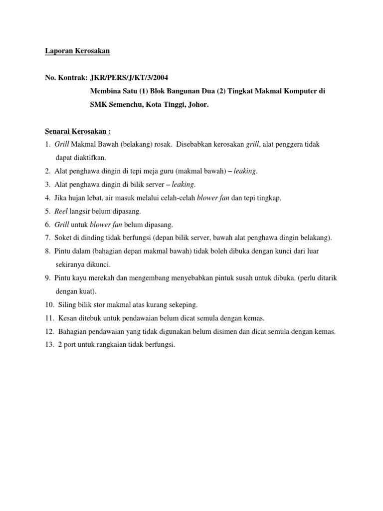 Contoh Surat Rasmi Laporan Kerosakan have an image from the otherContoh Surat Rasmi Laporan Kerosakan In addition it will feature a picture of a sort that could be observed in the gallery of Contoh Surat Rasmi Laporan Kerosakan. Alamat Kuarters Kuarters Institusi Pendidikan Chanis 26700 Muadzam Shah Pahang Darul Makmur Jumlah Blok 3 Blok A B dan C Nama Penghulu Kuarters En. Laporan Kerosakan Bangunan Makmal Komputer Sekolah.